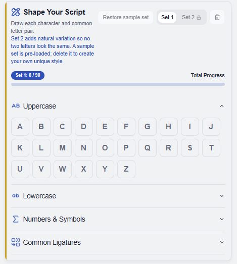 Use the icon to clear the sample set, then draw your own characters. For a natural look, draw the "Ligatures" and consider adding a second character set (a premium feature – Login/Signup to enjoy).